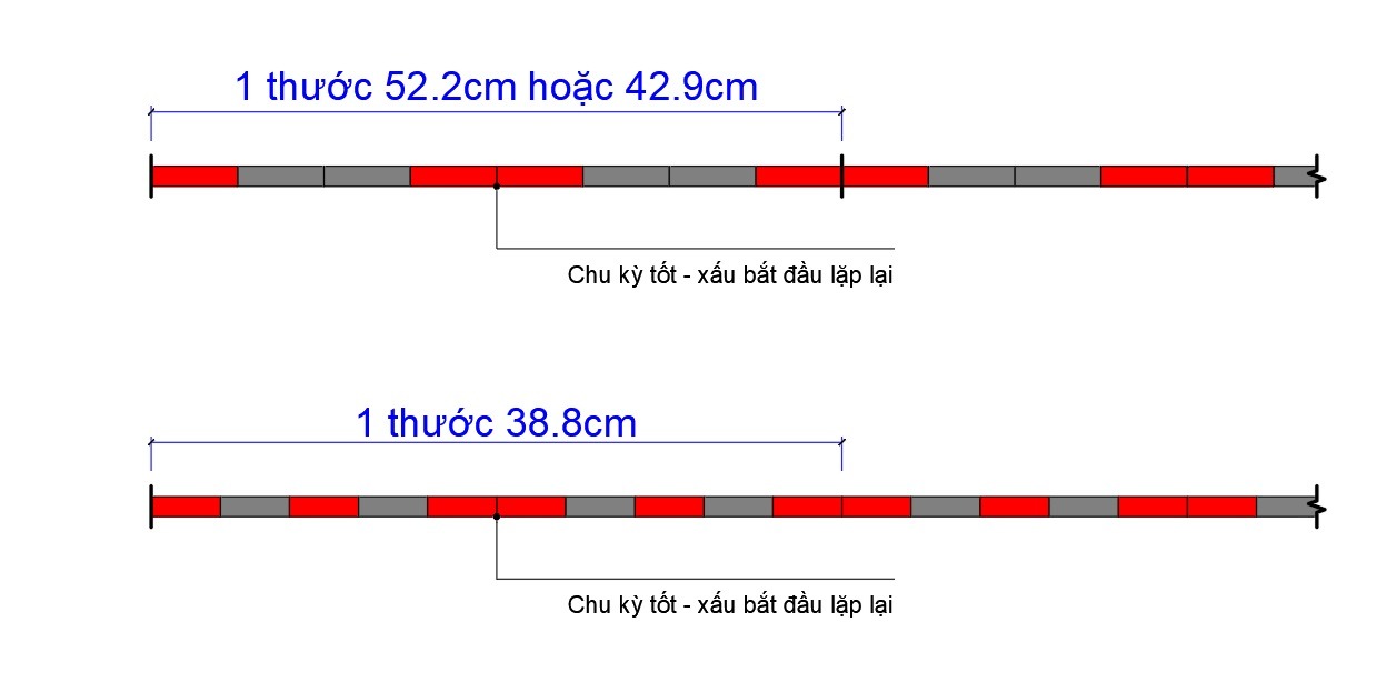 Với thước 38.8cm, chúng ta sẽ tính hơi khác một chút. Vì chu kỳ lặp lại của nó là nửa xích, nên chúng ta thực tế sẽ đếm theo nửa xích: