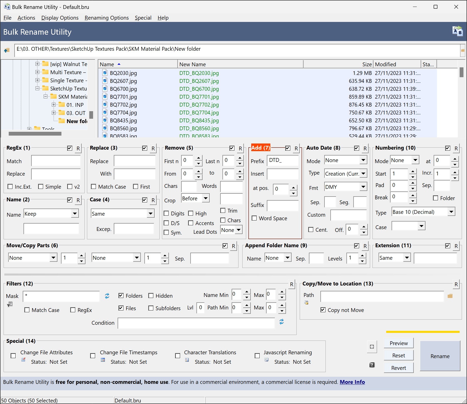 Trong quy trình của tôi, tên của texture cũng chính là tên của vật liệu. Vì thế, bạn cần đặt tên các file thật cẩn thận. Để có thể đổi tên nhanh hàng loạt các file, bạn có thể dùng một công cụ miễn phí có tên là Bulk Rename Ultility. Giao diện sử dụng của nó rất đơn giản, vì thế tôi sẽ không hướng dẫn nhiều về công cụ này. Bạn có thể dùng nó để thay thế, thêm bớt đầu đuôi, đánh số cho tên file.
