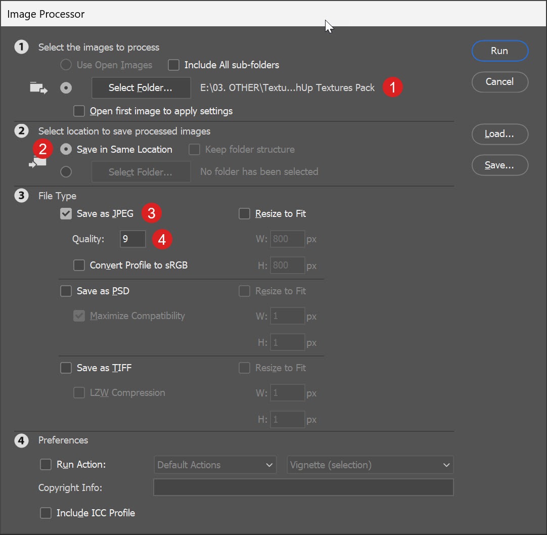 Bước 3: trong bảng Image Processor hiện ra. Chọn thư mục chứa các file texture ①, chọn mục Save as Same Location ②, tích vào Save as JPEG ③. Trong phần Quality ④, bạn nên thiết lập chất lượng từ 8-10. Chất lượng cao hơn không đem lại thay đổi đáng kể. Bạn có thể tích vào mục Resize to Fit để điều chỉnh lại kích thước texture nếu cần thiết.