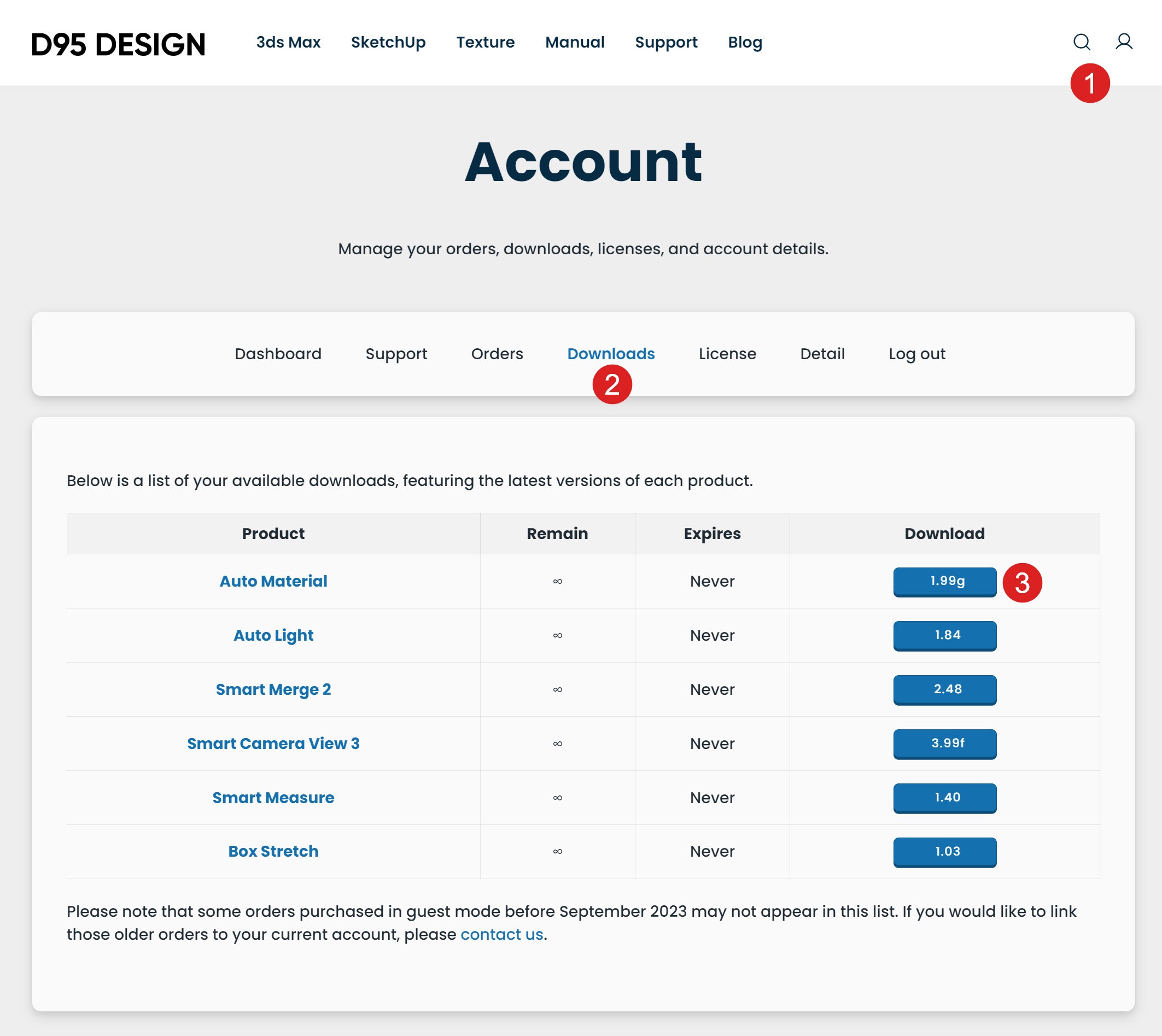 Sau khi đã đăng nhập thành công, hãy bấm vào Account ①, vào vào mục Download ②, bạn sẽ thấy những plugin mình đã mua, trong đó có Board Tools. Bấm vào nút có số phiên bản ③ tương ứng với dòng Board Tools, file cập nhật sẽ được tải về máy.