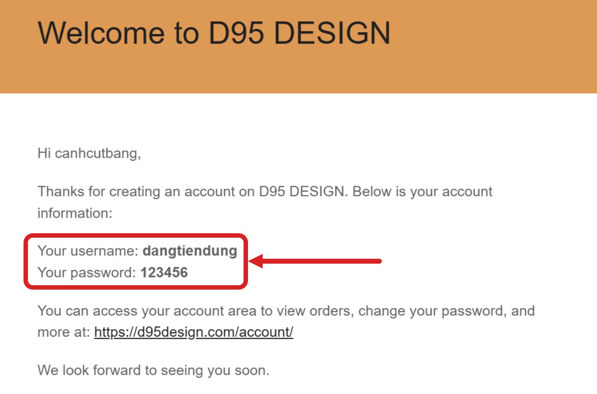 Nếu bạn mua hàng lần đầu, bạn sẽ nhận thêm 01 email để cấp tài khoản và mật khẩu để đăng nhập trên website. Hãy sử dụng thông tin đăng nhập trong email này để đăng nhập vào d95design.com để tới trang quản lý tài khoản.