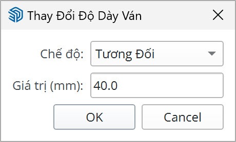 Bảng cài đặt sẽ hiện ra. Sẽ có 2 tùy chọn: Chế độ (tuyệt đối | tương đối), và Giá trị (mm). Trong chế độ tuyệt đối, plugin sẽ thay đổi độ dày của các ván đang chọn về chính xác giá trị người dùng nhập. Trong chế độ tương đối, plugin sẽ thay đổi độ dày của các ván đang chọn bằng cách cộng trừ thêm giá trị người dùng nhập.