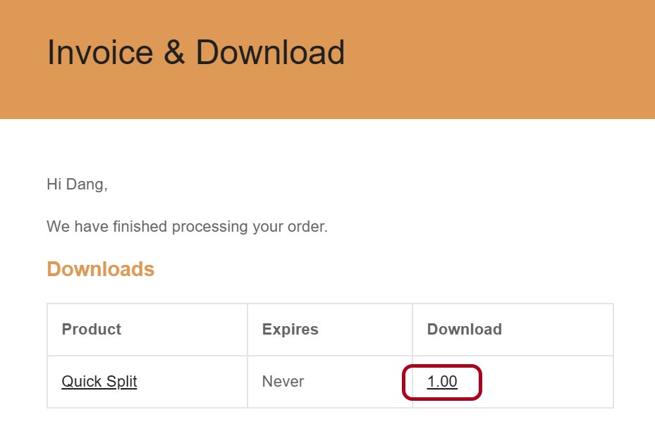 Sau khi đặt mua và thanh toán thành công, dù thông qua website hay thông qua facebook, bạn sẽ nhận được 01 email hóa đơn. Trong email này, hãy tìm tới cột Download, và bấm vào số phiên bản có gạch chân để tải.