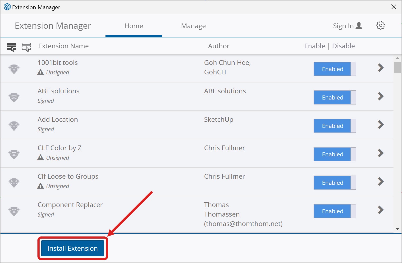 Lưu ý rằng, trong một số phiên bản SketchUp cũ, Extension Manager không nằm trong menu Extensions, mà nằm trong menu Window.
