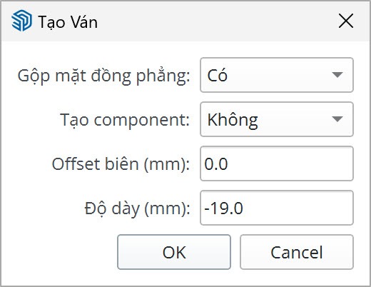 Bảng cài đặt sẽ hiện ra với 4 tùy chọn như hình: Gộp mặt đồng phẳng (có | không), Tạo component (có | không), Offset biên (mm), và Độ dày (mm). Trong ví dụ dưới đây, tôi sẽ ví dụ với 1 group gồm 4 mặt liền nhau, và thử điều chỉnh từng thông số.