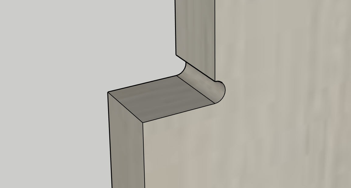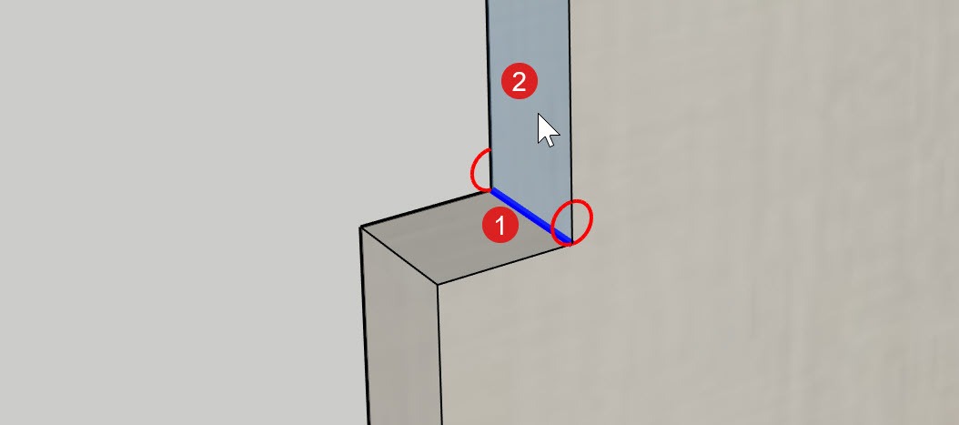 Sau khi cài đặt các thông số, bấm OK và bắt đầu di chuột tới các cạnh ở góc lõm của ván. Bạn sẽ cần click 2 lần. Lần thứ nhất, click vào cạnh ở góc lõm ①, và lần thứ hai là chọn một mặt liền kề ② để quyết định chiều khử dao.