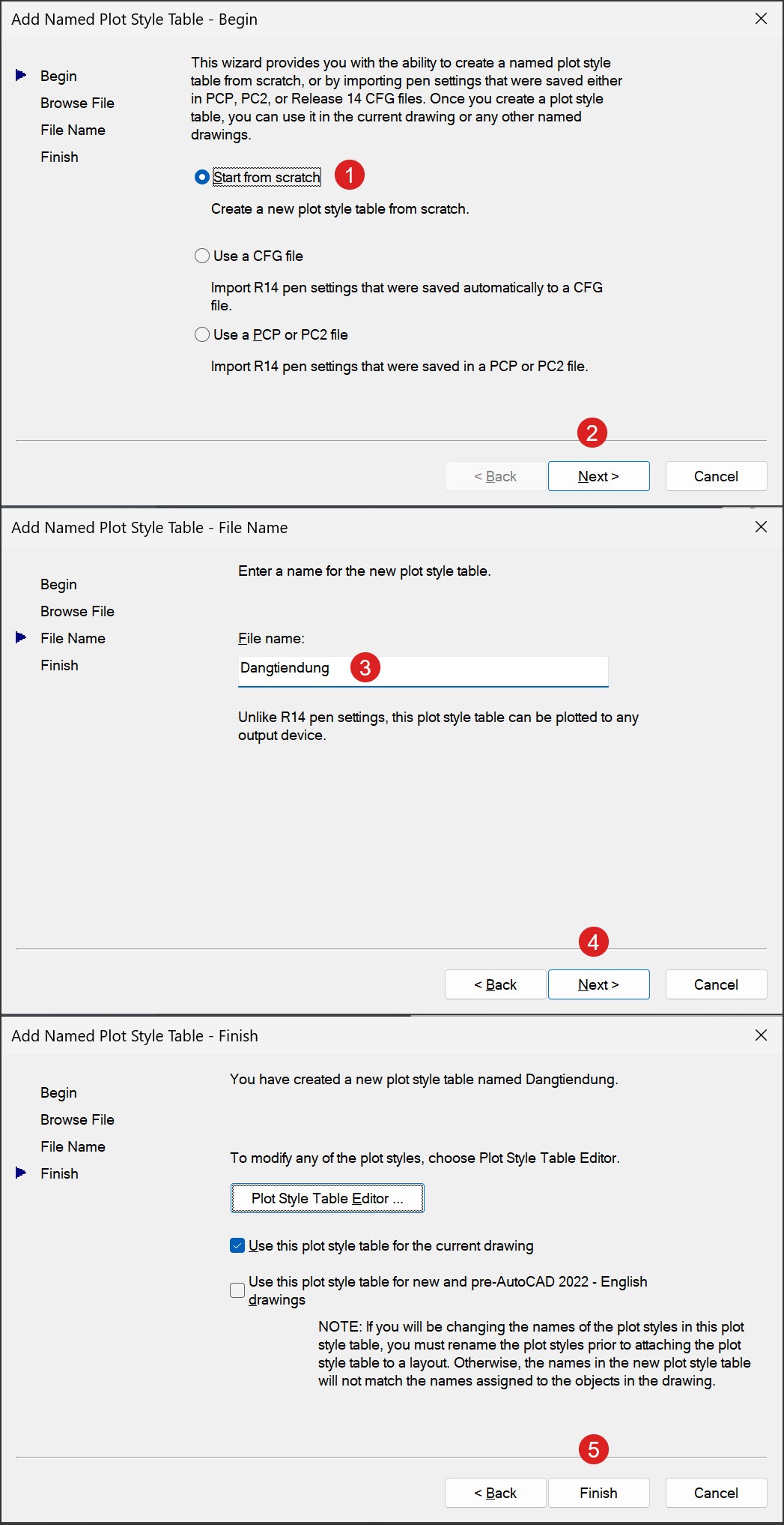 Mở lại bảng Plot bằng nút tắt Ctrl + P. Bấm vào danh sách Style Table, chọn New…, bảng Add Named Plot Style Table sẽ hiện ra. Chọn Start from scratch ①, sau đó bấm Next ②. Điền tên style bạn muốn thiết lập ③, sau đó bấm Next ④. Bước cuối cùng, bấm Finish ⑤ để hoàn thành việc tạo một file STB mới.