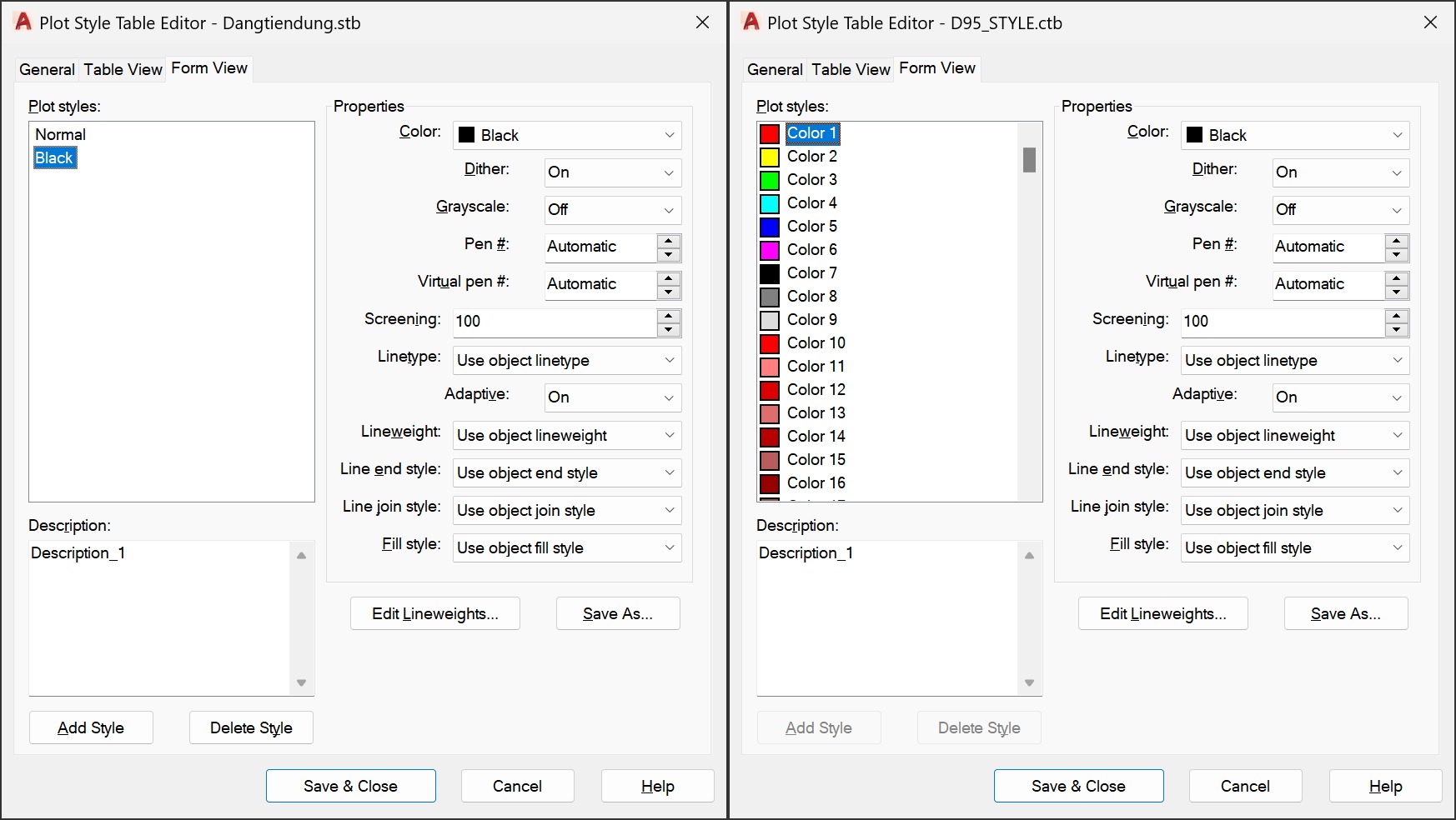 Sau khi tạo xong STB theo bước trên, bạn sẽ thấy tên file STB của bạn hiện trong mục Plot style table. Ví dụ, ở đây của tôi sẽ hiện là Dangtiendung.stb. Hãy bấm vào nút Plot Style Table Editor ngay bên cạnh để bắt đầu chỉnh sửa. Khi mới bật lên, có thể bạn sẽ thấy hơi bỡ ngỡ một chút, do tab mặc định khi mở lên sẽ là Table View, thay vì Form View như CTB.