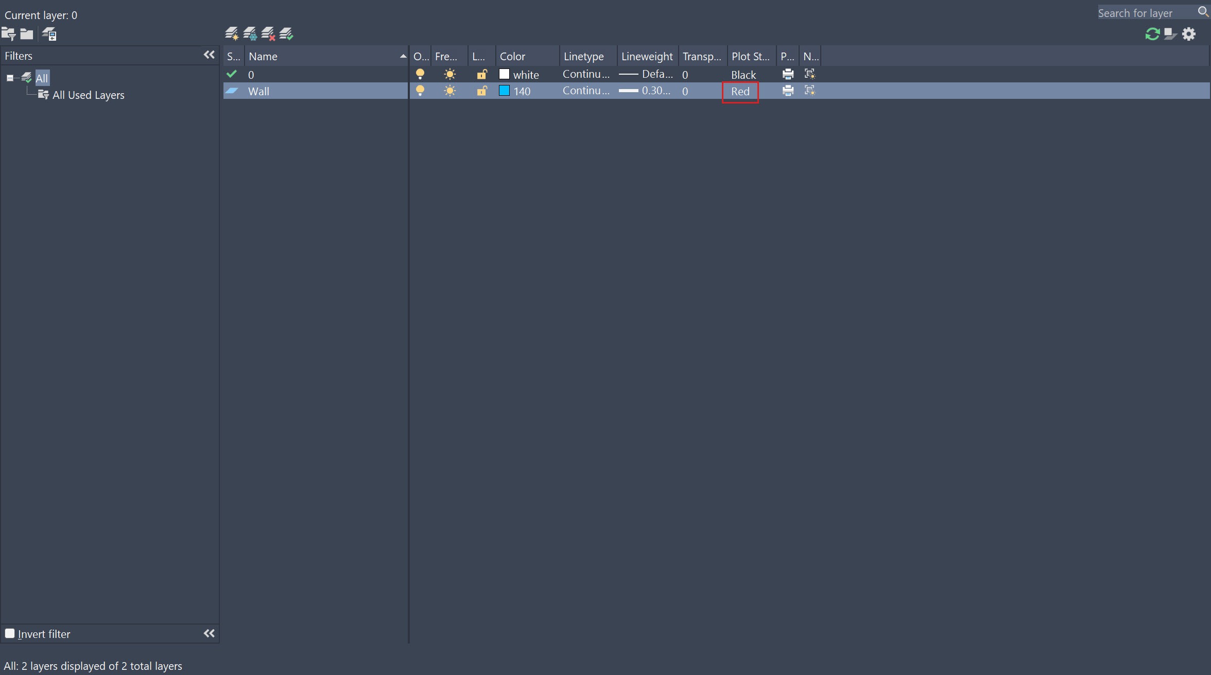 Từ giờ, bất kỳ nét vẽ nào của tôi trên layer Wall, khi in ra sẽ có màu đỏ. Tôi có thể thay đổi nhanh điều này bằng cách chọn Plot Style mới mà không cần chỉnh lại màu. Vì thế, nó không ảnh hưởng đến cách hiển thị màu sắc trên model.