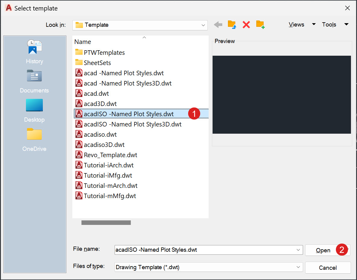 Để bắt đầu, hãy mở AutoCAD và tạo một bản vẽ mới bằng lệnh New (Ctrl + N). Bảng chọn template của AutoCAD sẽ hiện ra. Chọn template acadISO – Named Plot Styles.dwt ①, rồi bấm Open ②. Một bản vẽ mới sẽ được tạo ra. Lúc này bạn sẽ chưa thấy có gì lạ so với bản vẽ thông thường.