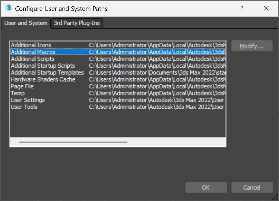 Mở 3ds Max, sau đó vào Customize > Configure User and System Paths. Trong tab User and System, tìm đến phần Additional Scripts và Additional Macros.